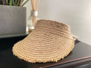 Protect yourself from the sun with this stylish straw woven visor. It has an adjustable white rope string closure with grommets at the back for holding your hair back. Lightweight and easy the wear.
